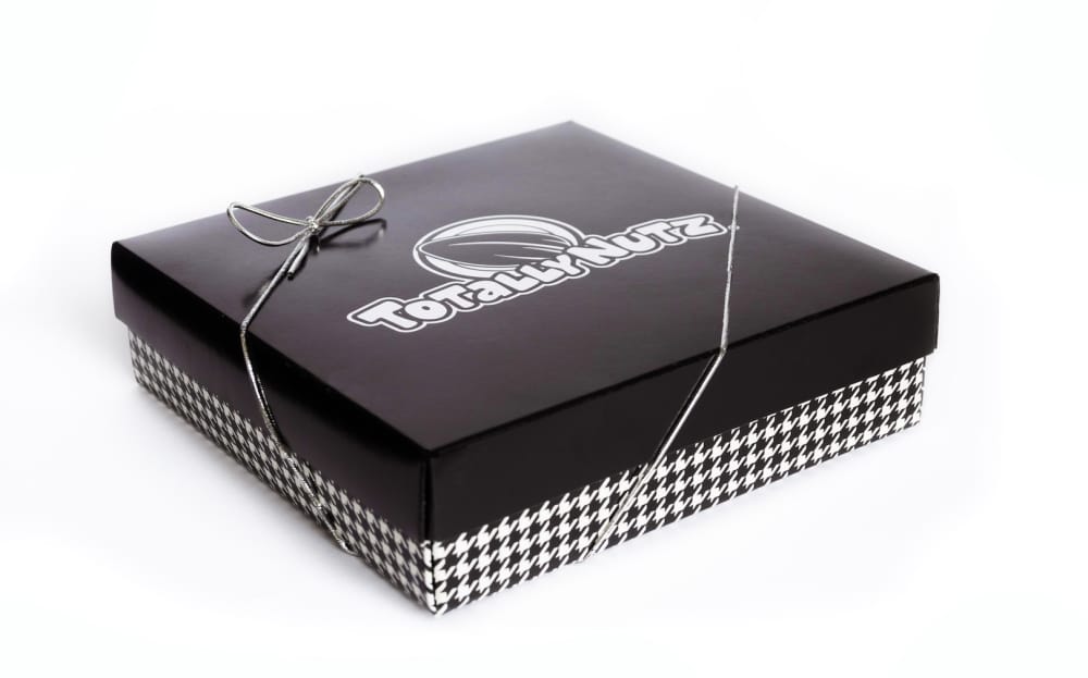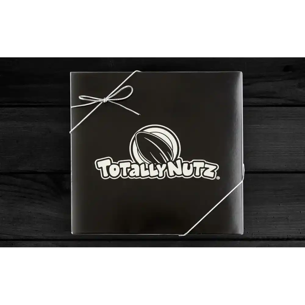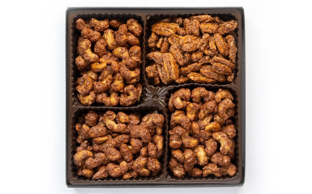 25 oz. of our Gourmet cinnamon glazed almonds (12. oz), pecans (6.5 oz), and cashews (6.5 oz), beautifully packaged in an elegant black top Totally Nutz gift box. This is perfect for any gift-giving occasion.